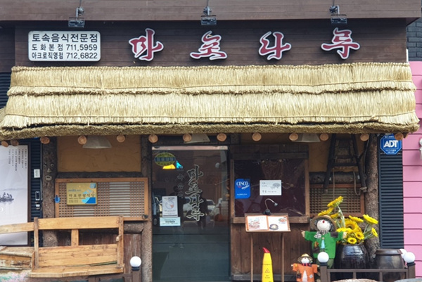 서울 지하철 5호선 마포역 3번 출구로 나와 대로를 벗어나 3분 정도 걸어가면 초가집처럼 생긴 음식점이 하나 눈에 띈다. 높은 빌딩 사이에 둘러싸여 독특한 이질감이 느껴지는 이곳은 30년째를 맞은 마포지역 대표 토속음식점 '마포나루'이다.