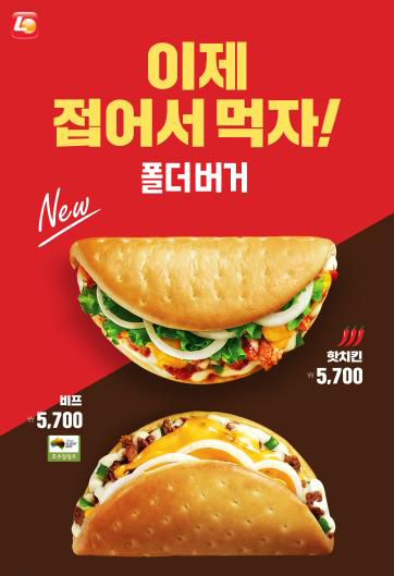 폴더버거 비프는 '단짠'(달고 짠맛) 소스와 모차렐라치즈로 맛을 냈고, 폴더버거 핫치킨은 '매콤달콤' 소스에 매운 핫치킨 토핑을 더했다. 1개당 가격은 각각 5700원이다.