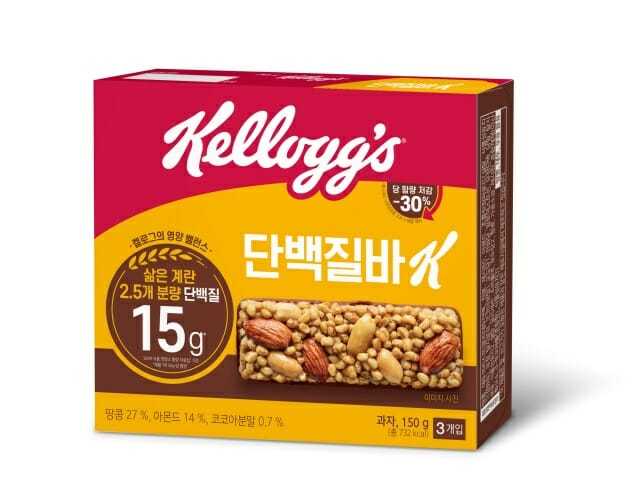 아미노산의 일종인 트립토판이 풍부한 견과류는 ‘행복 호르몬’으로 불리는 세로토닌 생성에 도움을 줘, 기분이 가라앉을 때 챙겨 먹으면 좋다. 증량은 기존 켈로그 단백질바보다 10g 늘어난 50g이며, 삶은 계란 2.5개 분량에 해당하는 단백질 15g을 담아 한 끼 대용으로도 충분하다. 프로틴 제품 선택 시 가장 중시하는 당 함량도 제품 1개당 9g으로 줄였다.