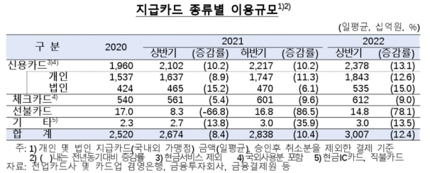 한국은행이 28일 발표한 '국내 지급 결제 동향'에 따르면 상반기 중 개인·법인의 신용·체크·선불카드 등 지급카드의 하루 평균 이용액은 3조원으로 지난해 같은 기간보다 12.4% 늘었다.