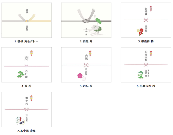 7종류의 노시(熨斗)는 동백꽃, 소나무, 매화, 금붕어, 국화 등이 그려져 있어 주문 시 용도에 맞게 선택하면 된다.