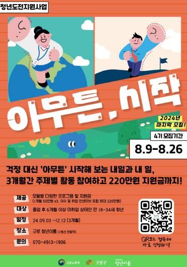 ‘청년도전지원사업, 아무튼 시작’은 구직을 단념한 18∼34세 청년을 발굴하여 일대일 상담, 퍼스널 브랜딩, 몸과 마음건강관리, 취업역량강화 특강 등 다양한 프로그램을 3개월간 제공하여 구직의욕을 높이고 사회진출을 돕는다.