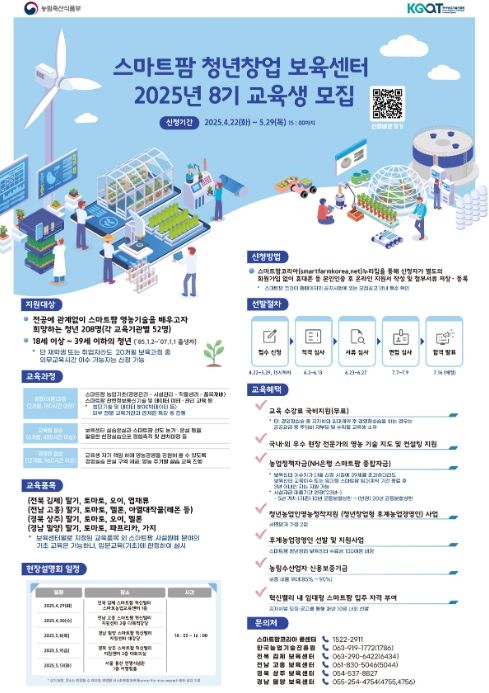 교육 신청 자격은 18세 이상 39세 이하의 청년으로, 전공에 관계없이 스마트팜 영농기술을 배우고자 하는 누구나 지원할 수 있다. 농식품부가 교육비 전액을 지원한다.