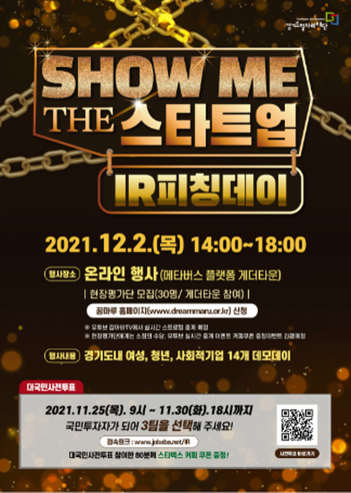 경기도일자리재단은 투자전문가뿐만 아니라 일반 국민들도 참여해 유망한 새싹기업(스타트업)을 뽑는 투자유치 발표 행사 ‘쇼미 더 스타트업 IR(투자유치)피칭데이’를 진행한다.