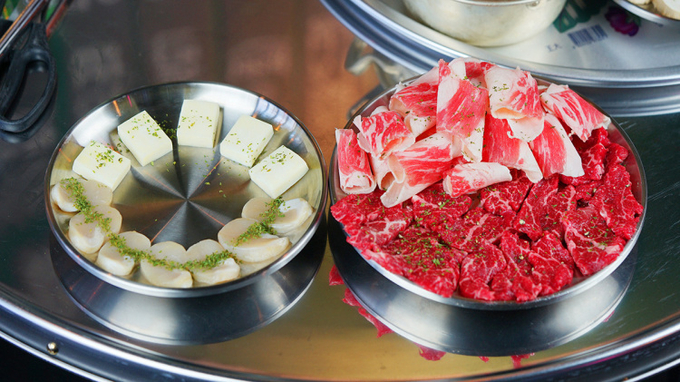 고기를 주문하면 우선 복고풍 쟁반에 담긴 한상차림이 준비된다. 시원하며 칼칼한 콩나물국, 야채구이, 샐러드, 묵은 백김치, 마늘, 소스 2종(청양, 파간장), 쌈장, 소금으로 이뤄졌다.