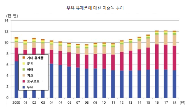 총무성 가계조사보고에 따르면 2000년 이래로 전체 유제품 지출액 추이는 2008년까지 감소세였으나 점차 회복해 최근 5년 사이에는 20년 전의 규모를 넘어선 채 유지되고 있다.