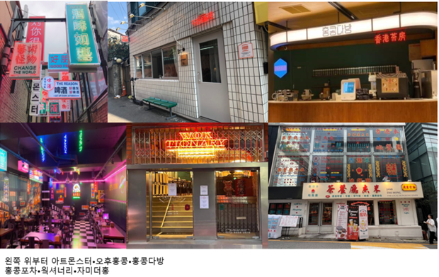 위의 [그림1] 사진은 ‘홍콩’이라는 공간적 배경을 모티프로 활용한 식당 브랜드들이다. 수제맥주집 ‘아트몬스터’, 홍콩의 메뉴와 인테리어를 옮겨 놓은 카페 ‘오후홍콩’과 ‘홍콩다방’, 홍콩의 밤거리를 형상화한 ‘홍콩포차’, 그리고 홍콩 인테리어와 식사 메뉴로 인기를 끌고 있는 ‘웍셔너리’와 ‘자미더홍’, 이 모두 홍콩이라는 공간적 배경을 모티브로 하여 식당브랜드로 승화시킨 예들이다.