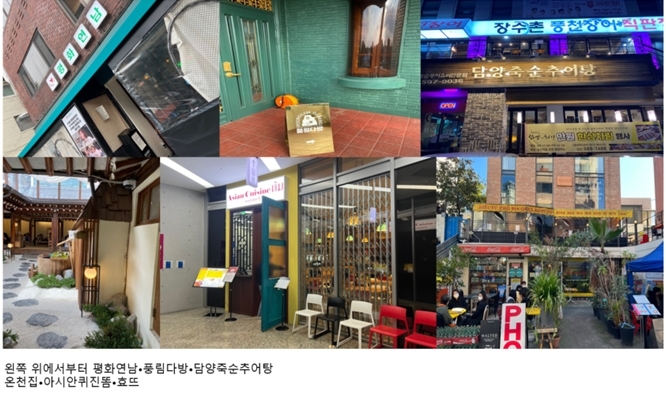 ‘평화연남’은 90년대의 시간을 옮겨 놓았다. 90년대의 음악과 인테리어, 제주에 위치한 ‘풍림다방’은 90년 가정집이라는 시간과 공간을, ‘담양죽순추어탕’은 식자재에 담양이라는 지역을 담았다. ‘온천집’은 일본의 로캰이라는 공간을 재해석했고, ‘아시안퀴진똠’과 ‘효뜨’는 베트남스트리트라는 공간의 감수성을 인테리어에 담았다. ‘