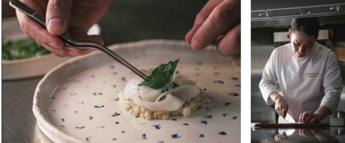 ‘목생 화’는 울릉도 오징어에 럼을 사용한 플람베 기법 으로 깊은 불 향을 입히고, 구수한 된장 크림 보리 리소토와 훈연 양파 파우더를 곁들여 진한 풍미를 완성했다. 메인 요리인 ‘화생토’는 울릉도 약초를 먹고 자란 약소의 채끝 등심 스테이크다. 여기에 산나물 페스토, 익힌 독도새우, 새우껍질로 만든 비스크 젤, 명이장아찌와 울릉도 더덕 테린을 층층이 레이어링하여 울릉도의 땅과 바다가 만드는 맛의 텍스처를 느끼도록 설계했다.
