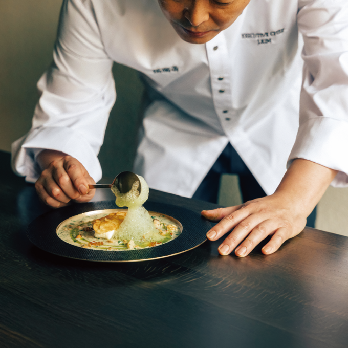 이 장광 속에 오직 숙박객을 위해 존재하는 ‘울릉 컨템퍼러리 다이닝’ <라 울>. 주방을 이끄는 전형우 총괄 셰프는 계절이 뚜렷하고 지형이 극적이며, 식재료의 성질이 강렬한 울릉도의 자연에서 우주 순환 원리인 ‘음양오행(수·목· 화·토·금)’을 발견했다. 모든 코스는 오행이 서로 돕고 살아가도록 하는 ‘상생’의 흐름에 따라 배열되어, 식사를 통해 대자연의 순환을 경험할 수 있게 차려진다. 지역 농가와 어부, 리조트 스마트팜 등 재료 출처를 세밀하게 전달함으로써 마치 울릉도 구석구석을 여행하는 듯한 기분도 선사한다.