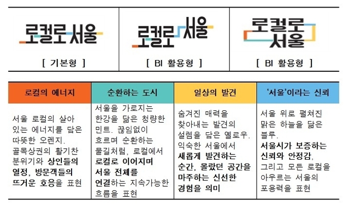 새롭게 개발된 BI에는 ‘로컬의 에너지’, ‘순환하는 도시’, ‘일상의 발견’, ‘서울이라는 신뢰’ 등 서울을 대표하는 네 가지 핵심 키워드가 시각적으로 담겼으며 이는 상인의 열정과 상권 간 연결, 신선한 경험, 서울시가 보증하는 상권이라는 의미를 담고 있다.