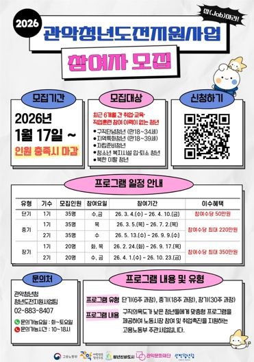 관악구가 구직을 단념한 청년들의 사회 진입을 돕기 위해 오는 1월 17일부터 ‘2026년 청년도전지원사업’ 참여자를 모집한다.