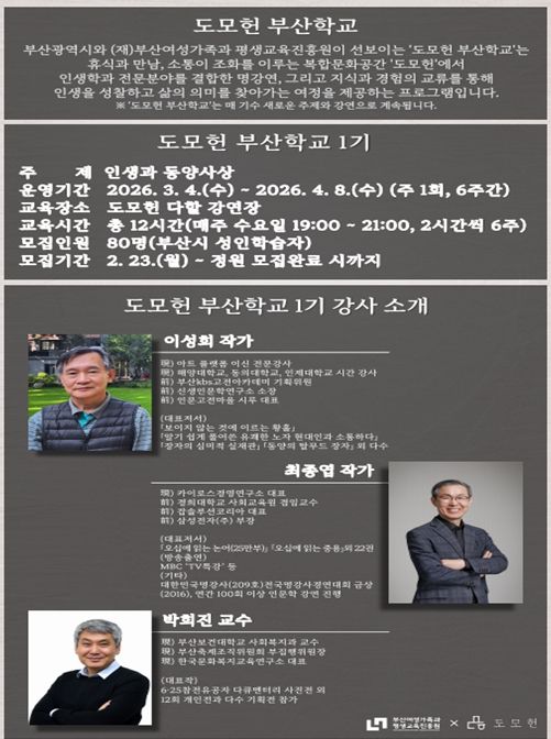 박근록 시 행정자치국장은 “'도모헌 부산학교'가 단순한 강의를 넘어 시민들이 서로의 경험을 나누고 인생 2막을 설계하는 실용적인 소통의 장이 되길 바란다”라며, “앞으로도 부산시민을 위한 고품격 교육 프로그램을 지속적으로 발굴해 나가겠다”라고 전했다.