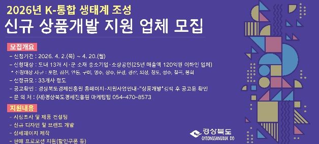 경상북도는 도내 유망 중소기업·소상공인의 제품 경쟁력 강화를 위해 ‘2026년 K-통합 마케팅 생태계 조성사업’의 일환으로 상품 기획부터 디자인·마케팅까지 전 과정을 지원하는‘신규 상품개발 지원사업’에 참여할 기업을 모집한다.