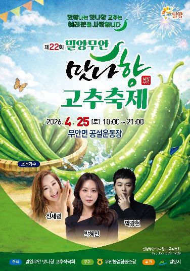 행사는 무안용호놀이와 무안농악 사물놀이 등 식전 공연을 시작으로 노래자랑, 트로트 콘서트, 색소폰 공연 등 다양한 프로그램으로 진행된다. 또한 ‘맛나향 고추 주제관’을 운영해 밀양 고추의 우수성을 알리고, 신선한 농산물을 현장에서 직접 구매할 수 있다.