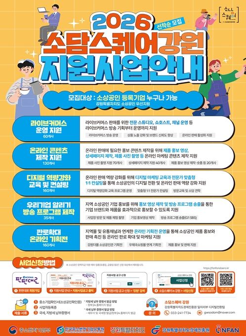 디지털커머스 전문기관 ‘소담스퀘어 강원’이 도내 소상공인의 성공적인 온라인 시장 진출과 디지털 전환을 돕기 위해 ‘2026년도 지원사업’ 참여 업체를 지난 13일부터 연중 상시 모집 중이라고 밝혔다.