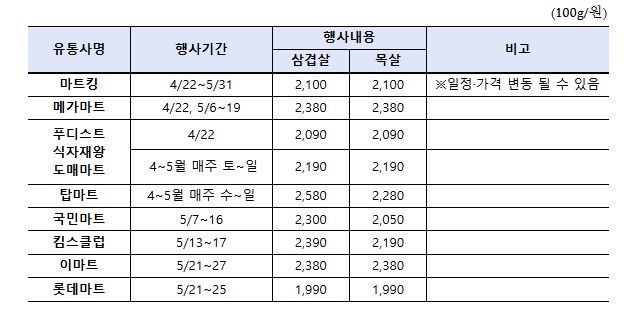 오프라인 할인행사는 전국 8개 마트에서 4월 22일부터 5월 31일까지 한돈 삼겹살, 목살을 최대 30% 이상 할인된 가격에 판매한다.