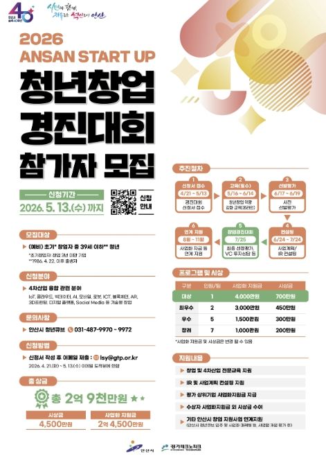 안산시는 창의적인 아이디어를 보유한 청년 창업가를 발굴하기 위해 내달 13일까지 ‘2026 안산 스타트업 청년창업 경진대회’ 참가자를 모집한다고 24일 밝혔다.