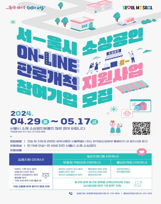 서울시는 ‘소상공인 온라인 판로개척 지원사업’에 참여할 청년 소상공인 450개 사를 5월 17일까지 모집한다고 밝혔다.