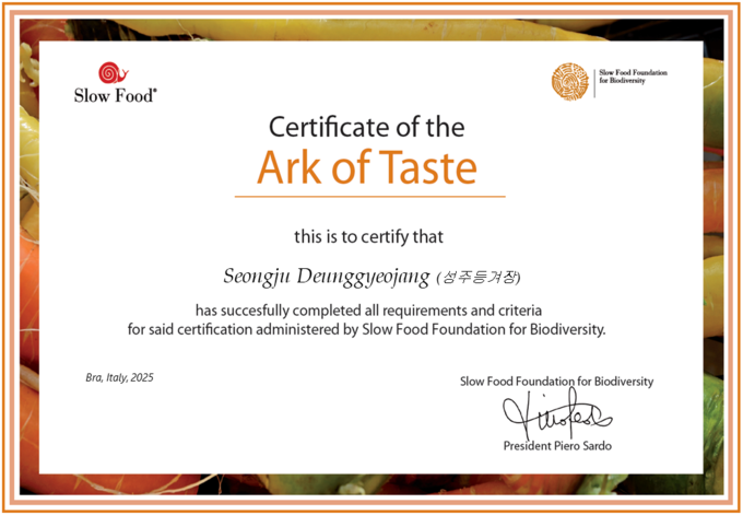 국제슬로푸드한국협회의 본산이자 1986년 설립된 국제슬로푸드협회는 이탈리아에 본부를 두고 있는 국제기구로 160개국이 회원국으로 활동하고 있다. 맛의방주는 사라질 위기에 처해 있어 보호가 필요한 지역의 문화와 역사, 전통이 깃든 음식 문화 유산을 복원하고 육성하는 국제 프로젝트다. 우리나라는 2013년도를 시작으로 이번 등겨장까지 총 124종을 맛의방주에 등재했다. 이는 전 세계에서 12번째로 많은 등재 성과다.