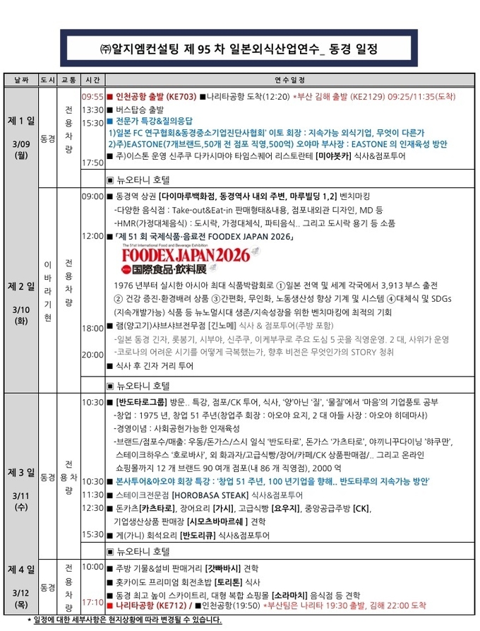 한편 알지엠컨설팅은 2026년 3월 9일부터 12일까지, 3박 4일간 제95차 동경외식산업연수를 진행할 예정이다. 연수와 관련한 자세한 사항은 ㈜알지엠컨설팅(02-3444-7339)에 문의하면 알 수 있다.