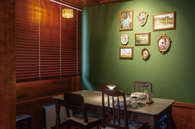 나무를 연상시키는 진한 초록색 캐노피와 벽, 목제 몰딩과 의자로 셰프의 자연주의 철학을 직관적으로 드러냈다. 편안한 분위기를 완성하기 위해 원하는 초록색을 찾을 때까지 페인트를 직접 발라보며 공을 들였다. 여기에 중세 유럽풍 액자와 천연 대리석을 조합해 프렌치 다이닝의 정체성을 드러냈다.