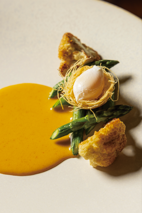 ‘아스파라거스’는 어린 시절 어머니가 데쳐준 브로콜리와 초고추장에서 영감받은 메뉴다. 아스파라거스를 진하게 우린 닭 육수에 가볍게 데치고 콜리플라워는 버터에 바싹 볶아낸다.