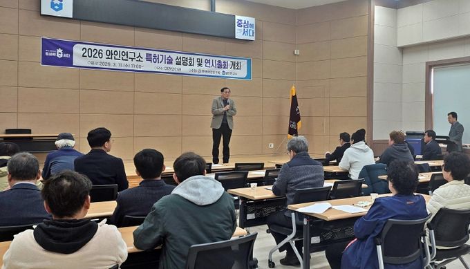충북농업기술원이 11일 미래와인관에서 국내 와인 제조업체 50명을 대상으로 ‘청수 주정강화 와인 제조기술’을 포함한 특허 18종 설명회를 진행했다.