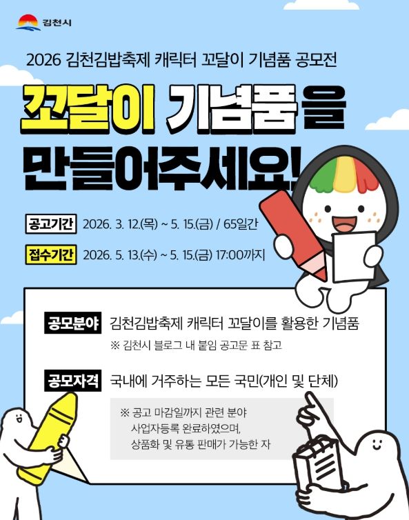 김천시는 김천김밥축제 캐릭터 ‘꼬달이’의 활성화와 창의적인 기념품 발굴을 위해 '2026 김천김밥축제 캐릭터 꼬달이 기념품 공모전'을 개최한다고 밝혔다.