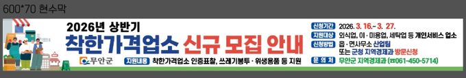 무안군은 고물가 상황에 따른 군민 생활 부담 완화와 지역 소상공인 지원을 위해 오는 27일까지 착한가격업소를 신규 모집한다고 밝혔다.