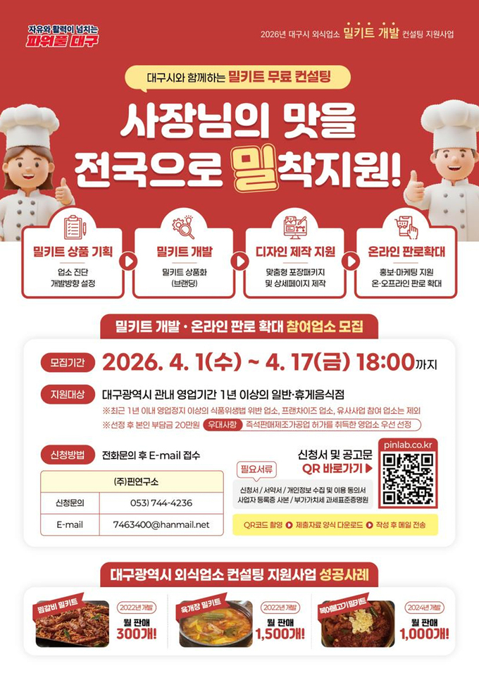 대구광역시는 지역 외식업소의 경쟁력을 높이고 온라인 시장 진출을 돕기 위한 ‘2026년 외식업소 밀키트 개발 컨설팅 지원사업’ 참여업소를 오는 4월 17일까지 모집한다.
