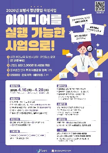 (재)충남창조경제혁신센터는 보령시와 함께 '2026년 보령시 청년창업 육성사업'에 참여할 예비 청년창업가를 오는 4월 29일까지 모집한다고 밝혔다.
