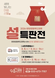 개장 이후 누적 매출 7억 8천만 원을 돌파하며 지역 농산물 유통의 성공 모델로 자리 잡은 양양군 로컬푸드마켓 ‘매일아홉시’가 설 명절을 맞아 설맞이 특별판매전을 개최한다. ‘매일아홉시’는 2024년 8월 개장 이후 181개 출하 농가가 참여해 300여 종의 농․특산물을 안정적으로 공급하며, 짧은 기간에도 불구하고 누적 7억 8,762만 원의 괄목할 만한 매출 성과를 기록해 지역 농가 소득 증대에 크게 기여하고 있다. 이 같은 성과를 바탕으로 마련된 이번 설맞이 특별판매전은 사전주문 행사(2월 4일~6일)와 본 판매행사(2월 12일~15일)로 나뉘어 진행되며, 명절 수요에 맞춘 구매 혜택을 대폭 강화됐다. 행사 기간 동안 농·특산물 및 가공품을 3만 원 이상 구매한 고객에게는 총 2,000장 한도 내에서 구매 금액 3만 원당 양양사랑상품권 3,000원권 1매가 지급된다. ▲3만 원 이상~6만 원 미만 구매시 1매 ▲6만 원 이상~9만 원 미만 구매시 2매 지급 등 구매 금액에 따라 혜택이 확대된다. 특히, 사전주문 기간(2월 4일~6일)에는 5만 원 이상 구매시 5만 원당 1건의 택배 무료 서비스가 제공돼, 명절 선물을 미리 준비하려는 소비자들의 편의성과 만