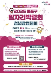 마포구는 구직자와 구인기업 간 만남의 장을 마련하고, 청년들의 창업문화를 확산하기 위해 오는 11월 4일(화) 오후 1시부터 5시까지 마포구청에서 ‘2025 마포구 일자리박람회·청년창업데이’를 개최한다. 이번 행사는 ‘기회 잡(Job)고(Go), 마포에서 시작!’을 슬로건으로, 취업과 창업을 동시에 지원하는 복합형 일자리 축제로 진행된다. 이를 통해 구직자에게는 폭넓은 채용의 기회를, 기업에는 맞춤형 인재를 만날 기회를, 청년 창업가에게는 자신의 아이디어를 선보이고 교류할 수 있는 장을 제공한다. 행사장은 ‘일자리박람회’와 ‘청년창업데이’ 두 개의 테마로 운영된다. 먼저 ‘일자리박람회’에서는 구인기업 15곳과 유관기관 8곳 등 총 23개 부스가 설치되어 구직자와의 1:1 현장면접과 마이더스IT 기반 AI면접 체험, 이력서·자기소개서 컨설팅, 퍼스널컬러 진단 등 구직자의 경쟁력을 높이는 다양한 취업지원 프로그램이 운영된다. 이날 오후 2시 10분부터는 마포구의회 다목적실에서 네이버와 YG엔터테인먼트 전‧현직자가 참여하는 대기업 채용설명회가 열린다. 기업의 인재상과 채용 과정, 실무 경험을 소개해 청년 구직자들에게 생생한 정보를 제공할 예정이며 별도의 사전 신청