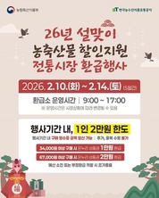 ■ 2026년 설맞이 농축산물 할인지원 전통시장 환급행사 - 2026.2.10.(화)~2.14.(토) (5일간) - 환급소 운영시간 9:00~17:00 ※ 운영시간은 시장상황에 따라 변경될 수 있음 · 행사기간 내, 1인 2만 원 한도 행사기간 내 구매 영수증 금액 합산 가능/ 추가, 중복 수령 불가 - 3만 4000원 이상 구매 시 온누리 상품권 1만 원 환급 - 6만 7000원 이상 구매 시 온누리 상품권 2만 원 환급 예산 소진 또는 부정환급 적발 시 조기종료 ■ 환급절차 ① 국내산 신선 농축산물 구매 후 영수증 수령 ② 점포주가 농축산물 환급 앱에 판매 정보 입력 ③ 구매 영수증, 본인확인 수단(휴대전화) 지참 후, 환급소 방문 ④ 구매한 영수증 및 본인확인 후 상품권 수령 ■ 행사대상 참여 점포에서 국산 신선 농축산물 구매한 고객 ■ 불가항목 · 본인확인 수단(휴대전화) 미지참 시 환급불가 · 국산 신선 농축산물이 아닌 품목 · 행사 미등록 점포 구매 영수증 · 재발행 영수증, 간이 영수증 환급 · 행사 기간 내 구매가 아닌 영수증 · 구매 고객이 아닌 대리인(ex. 구매는 본인이 했으나 지인이 대신 환급 받는 경우) ■ 문의전화: 02-6956-2