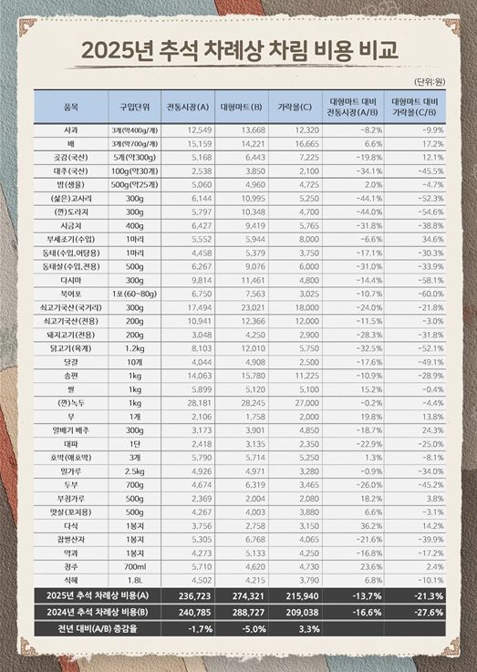 서울시농수산식품공사는 추석 명절 장보기에 도움이 되는 정보를 시민에게 제공하고자 서울시 내 대형마트, 전통시장, 가락시장(가락몰) 총 25곳을 대상으로 진행한 ‘추석 차례상 차림 비용’ 조사 결과를 발표했다.