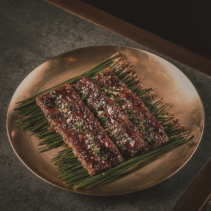 ‘김부각 육회’와 ‘간 장 새우장’은 안주를 타파스 스타일로 풀어낸 대표 메뉴다. 먼저 ‘김부각 육회’는 하루 동안 말려 튀겨낸 한 입 크기의 김부각에 다시마와 말린 표고 버섯 등으로 에이징한 육회 간장 소스를 곁들인다.
