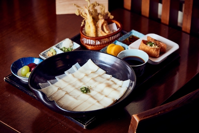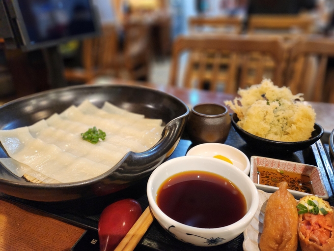 또한 ‘히노야마 우동정식’에는 유부초밥과 계란찜, 고구마, 팽이버섯, 단호박, 깻잎 등 방금 막 튀겨낸 바삭한 튀김이 함께 구성되어 있어 푸짐한 우동 한상을 즐길 수 있다.
