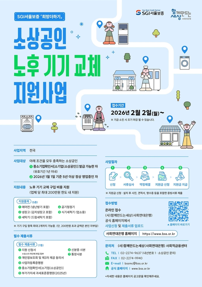 사단법인 함께만드는세상(사회연대은행)은 SGI서울보증과 협력해 ‘희망더하기’ 사업의 일환으로 경기침체로 어려움을 겪고 있는 소상공인의 경영환경 개선을 위해 ‘노후 기기 교체 지원사업’을 본격 시행한다.