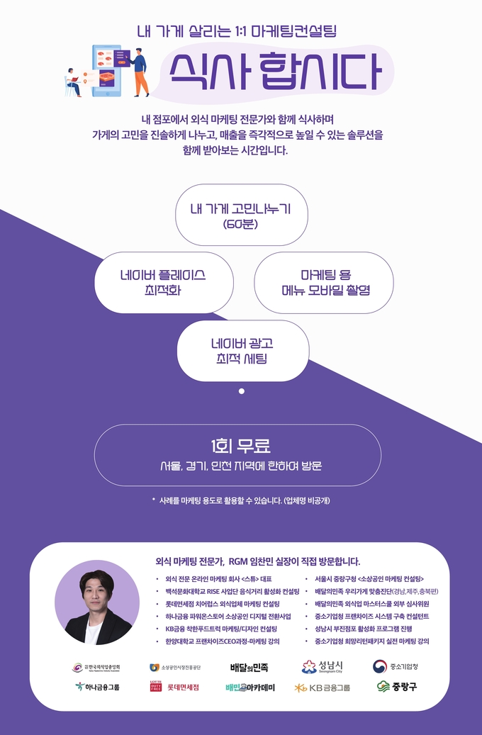 그동안 저는 알지엠의 컨설팅 노하우와 스튜의 마케팅 전문성으로 함께 많은 부분 업무 협력을 진행하고 있었습니다. 알지엠컨설팅의 강태봉 대표님처럼 저도 오롯이 외식업을 전문으로 컨설팅과 마케팅을 수행하며, 배민아카데미, 기업, 지자체등에서 음식점 사장님들의 매장을 직접 찾아가 1:1 컨설팅을 수행하였습니다.