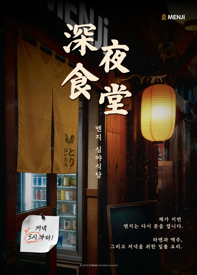 더불어 멘지는 일부 오피스와 대학가 상권 매장을 중심으로 ‘심야식당’ 콘셉트의 신메뉴도 선보일 예정이다. 오는 2월 9일(월)부터 멘지 상암DMC점과 멘지 경희대점 2개 매장에서 처음 선보이는 심야식당 메뉴는 저녁 5시부터 이용 가능하다. ‘닭 육수 라멘’ 전문점이라는 멘지의 강점을 살려 닭 육수와 수비드 닭가슴살 등 라멘에 사용되는 시그니처 재료를 활용한 이자카야형 메뉴를 마련했다.