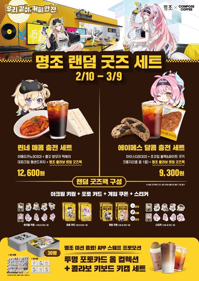 이번 협업은 지난해 6월 진행된 명조 1주년 기념 콜라보의 성과에 힘입어 기획된 두 번째 프로젝트다. 컴포즈커피는 명조 세계관을 반영한 콜라보 메뉴와 다양한 한정 굿즈, 참여형 이벤트를 통해 고객들이 일상 속에서 색다른 협업 콘텐츠를 경험할 수 있도록 할 예정이다.