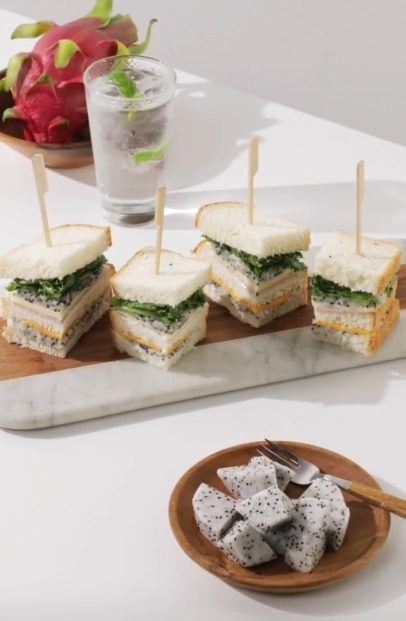 식빵에 마요네즈와 요거트 소스를 바른 뒤 으깬 용과와 치즈를 올리고, 햄·상추 등 기호에 맞는 재료를 더해 층층이 쌓는다. 꼬치로 고정한 후 커팅하면 한층 정갈한 비주얼로 완성된다.