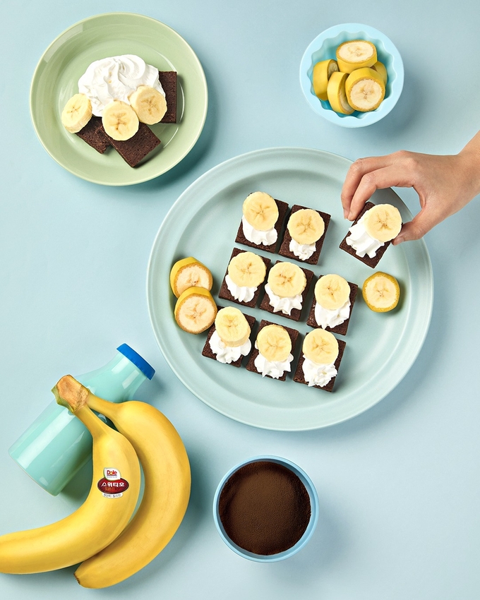 돌코리아 스위티오 바나나를 활용한 ‘바나나 브라우니’는 밀가루 없이 만들 수 있는 간편 디저트다. 바나나 3개를 코코아 파우더, 땅콩버터와 함께 갈아 반죽을 만든 뒤, 180℃로 예열한 오븐에서 약 20분간 구우면 완성된다. 기호에 따라 바나나 슬라이스나 생크림을 곁들여 장식할 수 있다.