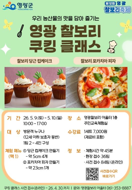 영광군은 오는 5월 9일부터 5월 10일까지 열리는 ‘영광 찰보리 축제’ 기간 동안, 찰보리를 활용한 체험 프로그램인 ‘찰보리 쿠킹클래스’를 운영한다고 밝혔다.