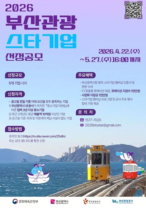 부산시와 부산관광공사는 부산관광기업지원센터가 외국인 관광객 500만 시대를 선도할 지역 관광산업의 핵심 주역을 발굴하기 위해 '2026 부산관광 스타기업 공모'를 실시한다고 밝혔다.