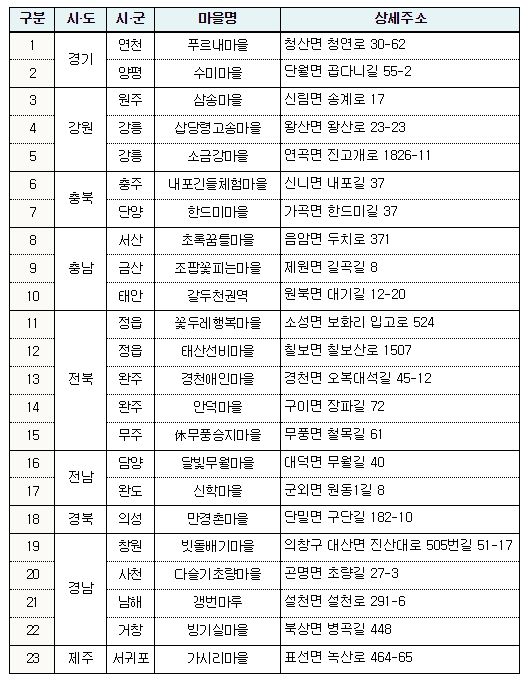 심사결과 체험 124개소, 음식 47개소, 숙박 88개소가 1등급을 받았으며, 이중 농촌체험휴양마을 23개소가 3개 부문(체험·음식·숙박) 모두 1등급을 받아 ‘으뜸촌’으로 선정됐다.
