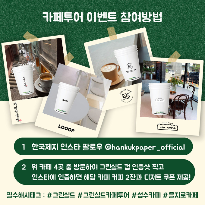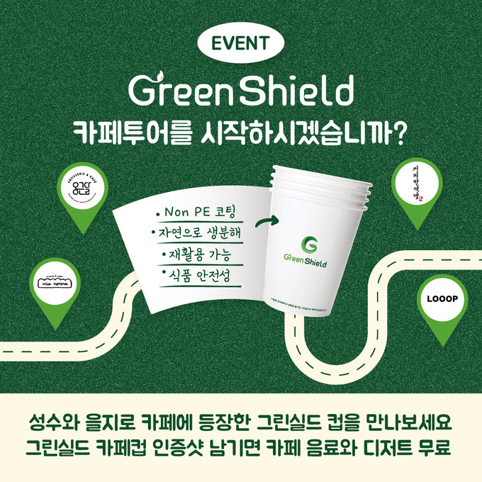 이에 한국제지는 친환경 문화 확산을 위해 대기업 외에도 친환경 제품에 관심이 많은 중소 카페들과 제휴 이벤트를 기획했고, 그 결실로 을지로와 성수동 내 카페 4곳(커피한약방, LOOOP, Mia nonna, 옹근달)에 그린실드로 만들어진 종이컵을 무상 협찬하며 친환경 활동 확산을 위해 앞장섰다.