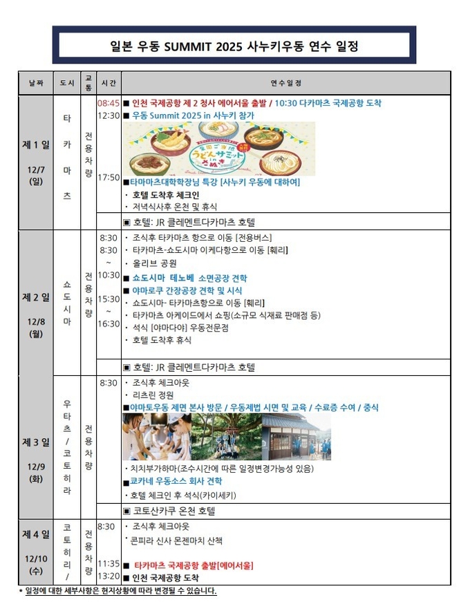 먼저 연수 첫날에는 일본 3대 우동이라 일컫는 ▲사누키 우동(카가와현), ▲이나니와 우동(아키타현), ▲미즈사와 우동(군마현)을 포함 전국 19개 현의 일본 지역 명물 우동이 한자리에 모인 '전국 우동 써밋(SUMMIT) 사누키2025’ 박람회를 참관한다.