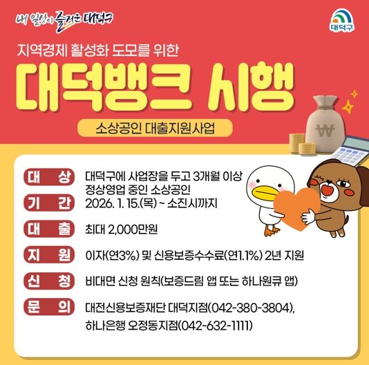 대전 대덕구는 경기침체로 자금 운용에 어려움을 겪는 지역 소상공인의 금융 부담을 완화하기 위해 소상공인 대출지원사업 ‘2026 대덕뱅크’를 시행한다.